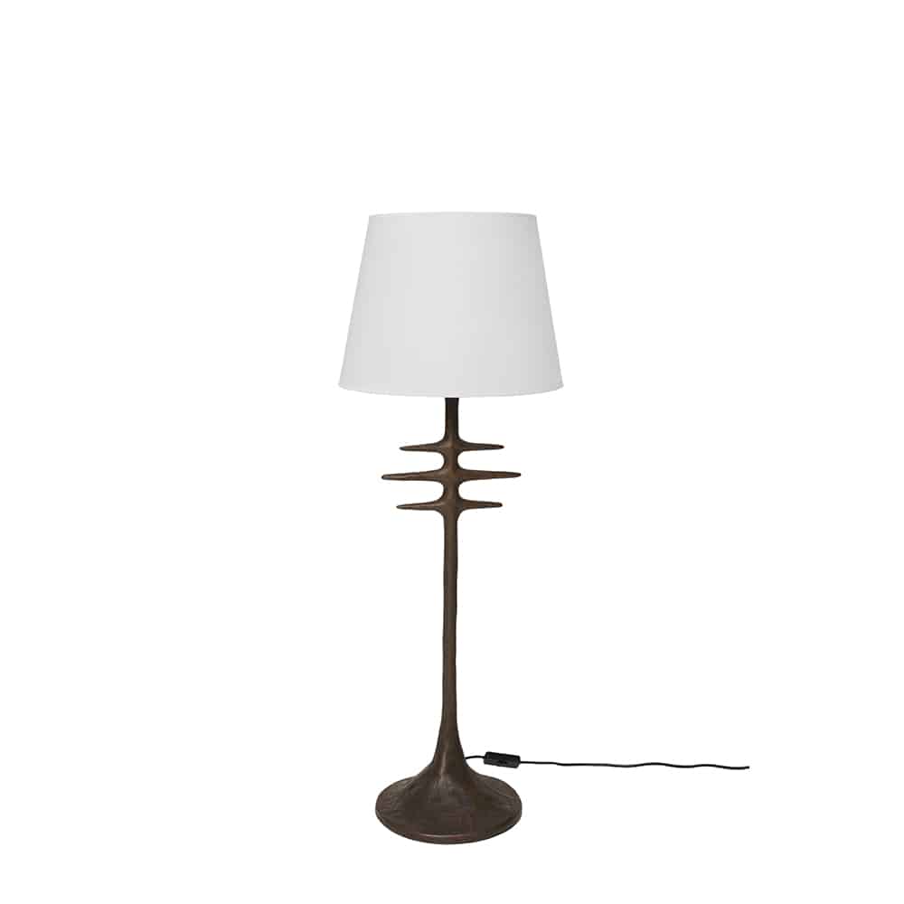 A hand-forged steel lamp base, designed and made by a true artisan. Available in chalk white or an aged bronze finish.